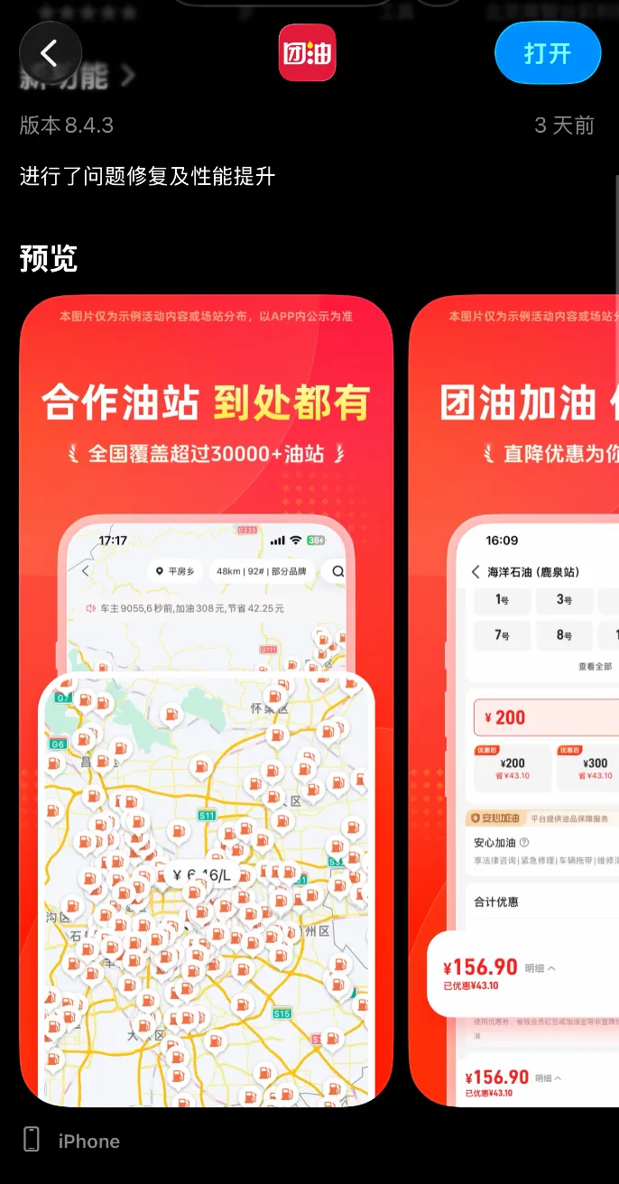 APP详情页显示,合作油站到处都有,全国覆盖超过3万座加油站,团油加油低至8折。