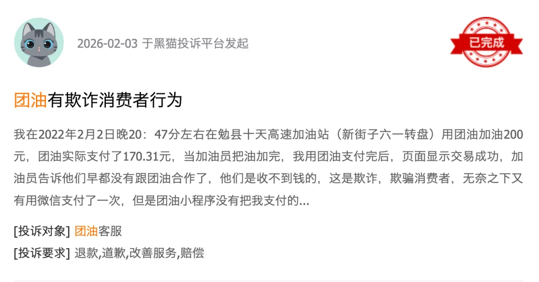 时至今日,有关团油的投诉不降反增。流量狂欢之下,受伤的始终是冲着“省钱”二字而来的普通车主。虽然直播间的话术越来越动听,优惠的套路越来越隐蔽,但那些“低至8折”的宣传话术剥开来看,背后不过是换了包装的旧套路。