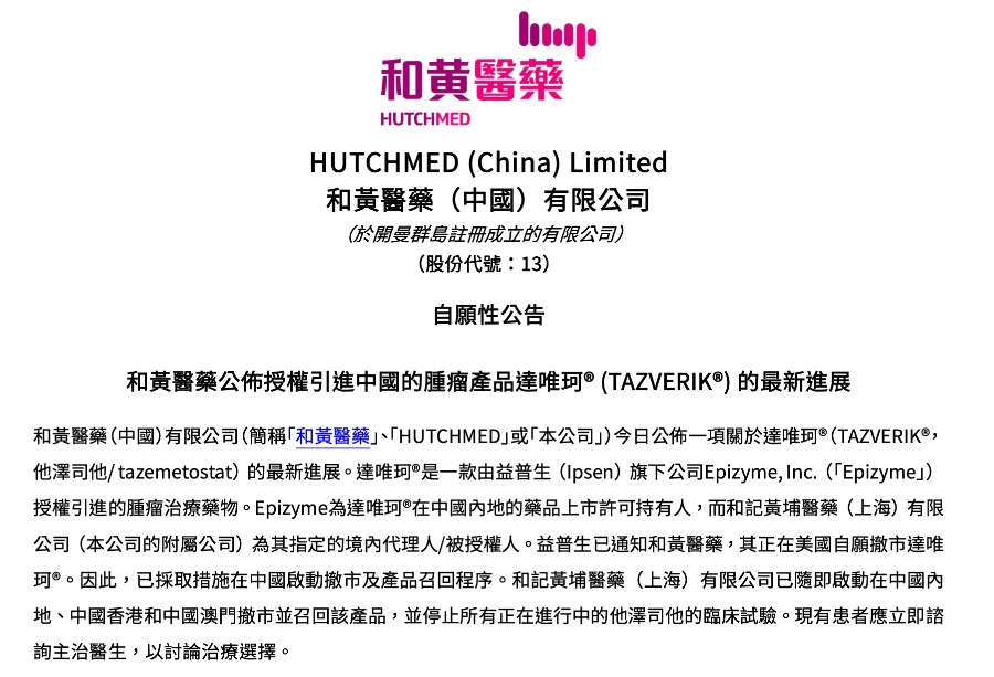 3月9日晚间,和黄医药发布公告称,已在中国内地、香港及澳门启动达唯珂®撤市及产品召回程序,并同步停止所有正在进行的他泽司他的临床试验。此次调整源于,原研企业益普生通知将在美国自愿撤市该药品,并同步停止相关临床试验,和黄医药随即响应。