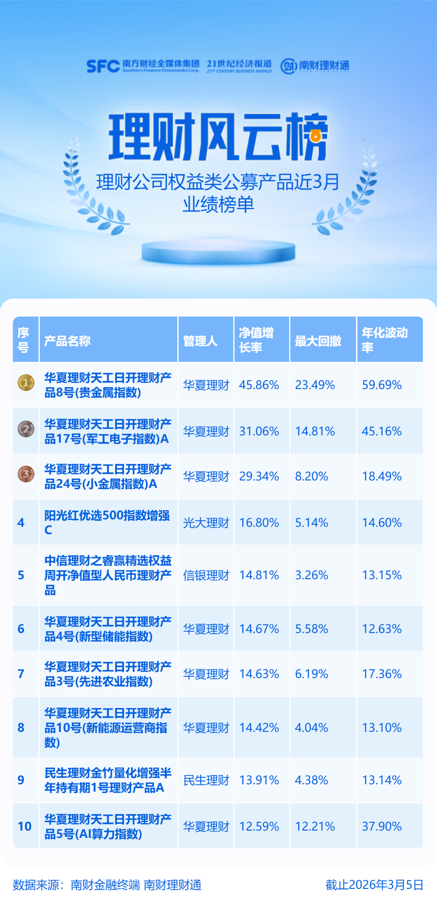 2026开年以来有色金属板块继续震荡上行。近三个月,小金属(申万)、贵金属(申万)指数分别涨超56%、47%,位列124个申万二级行业中涨幅第三名、第五名。相关板块的上涨传导至权益类理财产品,华夏理财“天工日开理财产品8号(贵金属指数)”、“天工日开理财产品24号(小金属指数)A”两只产品近三个月分别涨45.86%、29.34%,位列榜单第一名、第三名,涨幅居前。