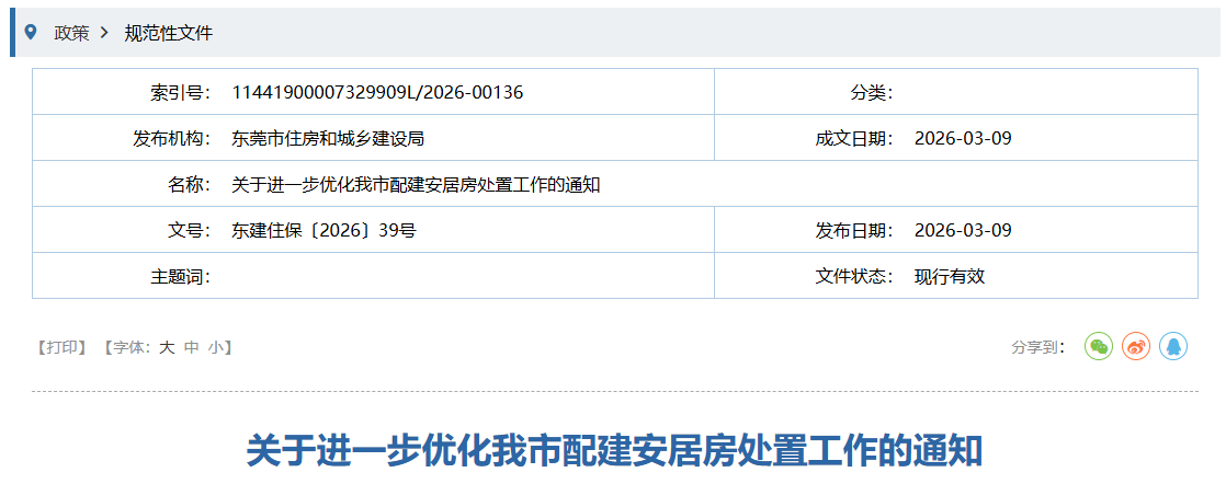 3月9日,东莞市住房和城乡建设局发布《关于进一步优化我市配建安居房处置工作的通知》。据通知,东莞将进一步优化人才购房优惠标准及申请条件。通知自发布之日起实施,也即3月9日起实施。