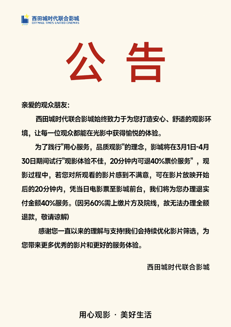 近日,杭州西田城时代联合影城公告称,2026年3月1日至4月30日期间,影城将正式试行“观影体验保障服务”。如果顾客在所购场次影片开始放映后的20分钟内,感觉影片不符合预期,只需走出影厅,凭手中的当日电影票至影城前台,影城将立即退还实付金额的40%。