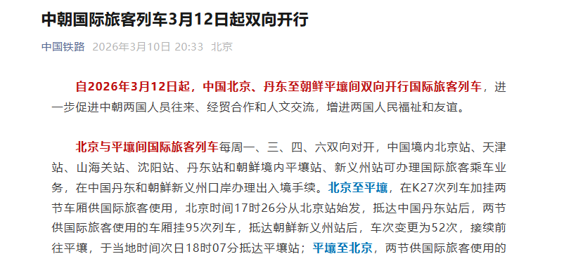 自2026年3月12日起,中国北京、丹东至朝鲜平壤间双向开行国际旅客列车,进一步促进中朝两国人员往来、经贸合作和人文交流,增进两国人民福祉和友谊。