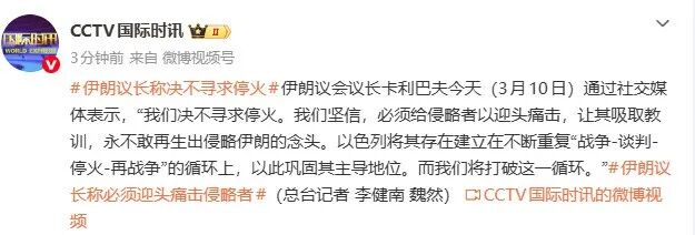 伊朗议会议长卡利巴夫今天(3月10日)通过社交媒体表示,“我们决不寻求停火。我们坚信,必须给侵略者以迎头痛击,让其吸取教训,永不敢再生出侵略伊朗的念头。以色列将其存在建立在不断重复‘战争-谈判-停火-再战争’的循环上,以此巩固其主导地位。而我们将打破这一循环。”