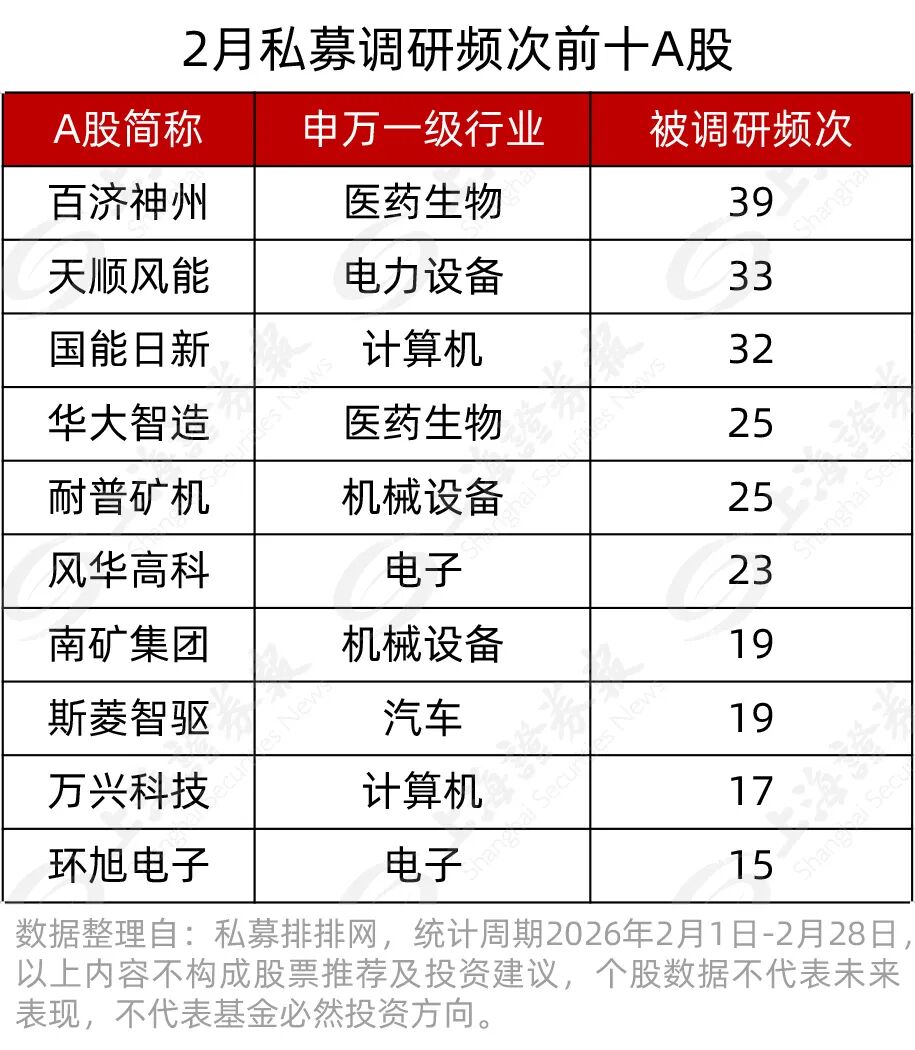 据私募排排网统计,2月私募调研频次超过700次,其中调研频次最高的个股为百济神州,包括景林资产、高毅资产、重阳投资在内的12家百亿级私募参与调研,重点关注百济神州如何平衡研发投入和财务改善、如何看待百悦达国内未来市场前景等问题。同时,2月天顺风能接受私募调研的频次也超30次,吸引了淡水泉、勤辰资产等百亿级私募前去调研,机构重点询问了其国内海风导管架的单吨盈利情况、2026年出货量、名义产能情况等。