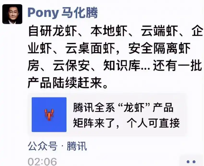 3月11日凌晨2:06,腾讯董事会主席兼首席执行官马化腾在朋友圈转发腾讯全系“龙虾”矩阵产品相关内容,并配文:“自研龙虾、本地虾、云端虾、企业虾、云桌面虾,安全隔离虾房、云保安、知识库……还有一批产品陆续赶来。”