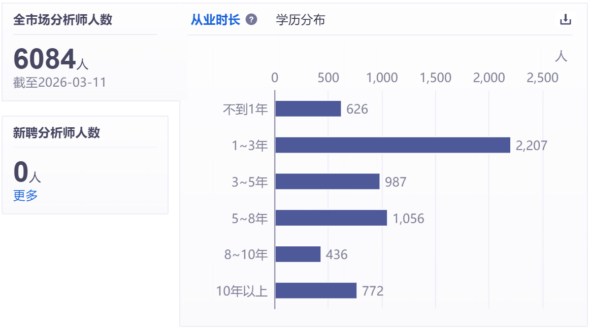 同花顺iFinD数据显示,截至3月11日,证券分析师人数已增至6084人,较2025年末净增55人。就从业年限分布看,行业呈现明显结构特征:不足1年的新人有626人,1-3年的分析师为绝对主力,共2207人;5-8年区间1056人,8-10年区间人数最少,10年以上资深分析师有772人,存在一定人才断层。