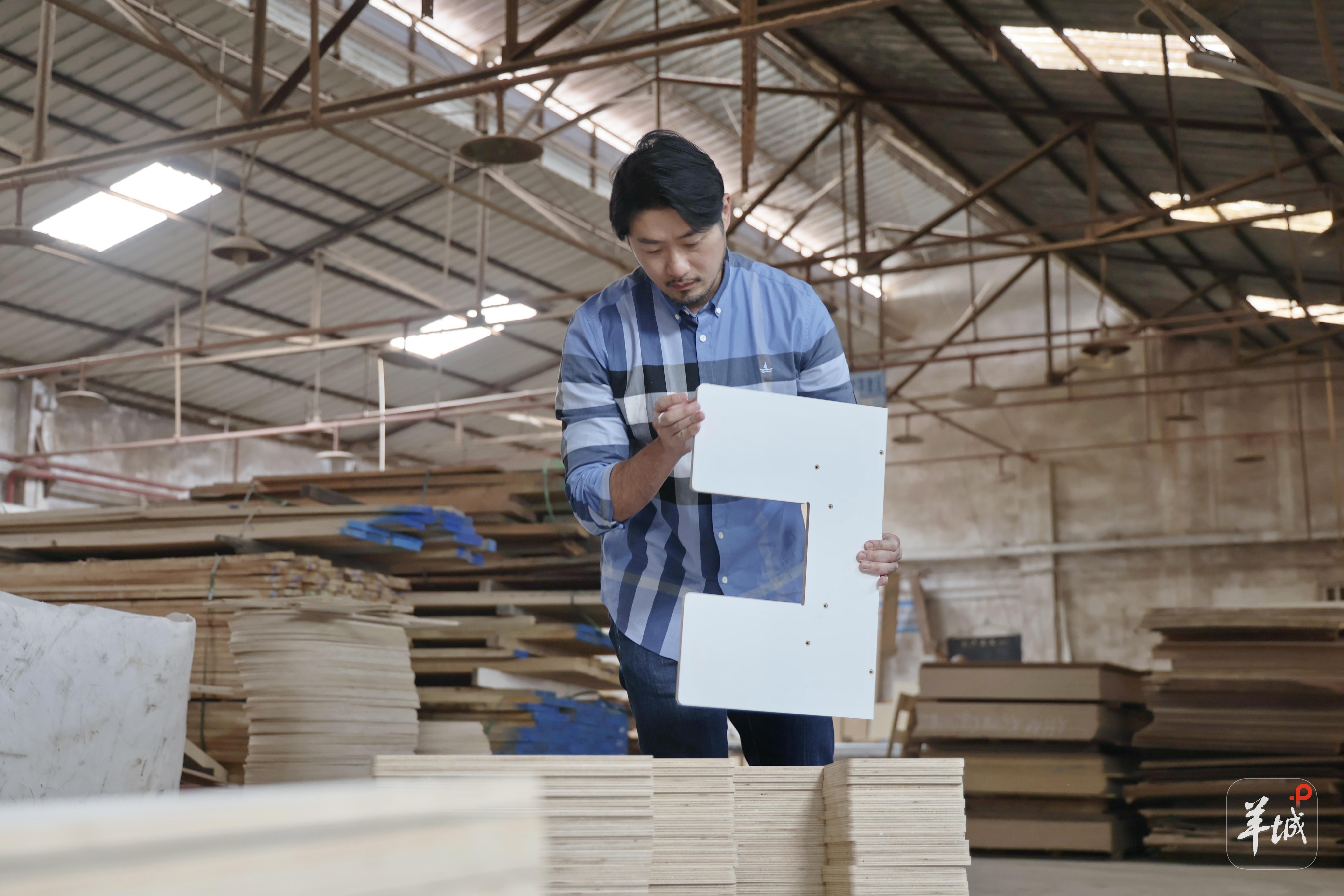 位于广东中山凯崴木业有限公司的工厂内,台湾青年黄冠杰正在查看制作家具的配件。刘畅 摄