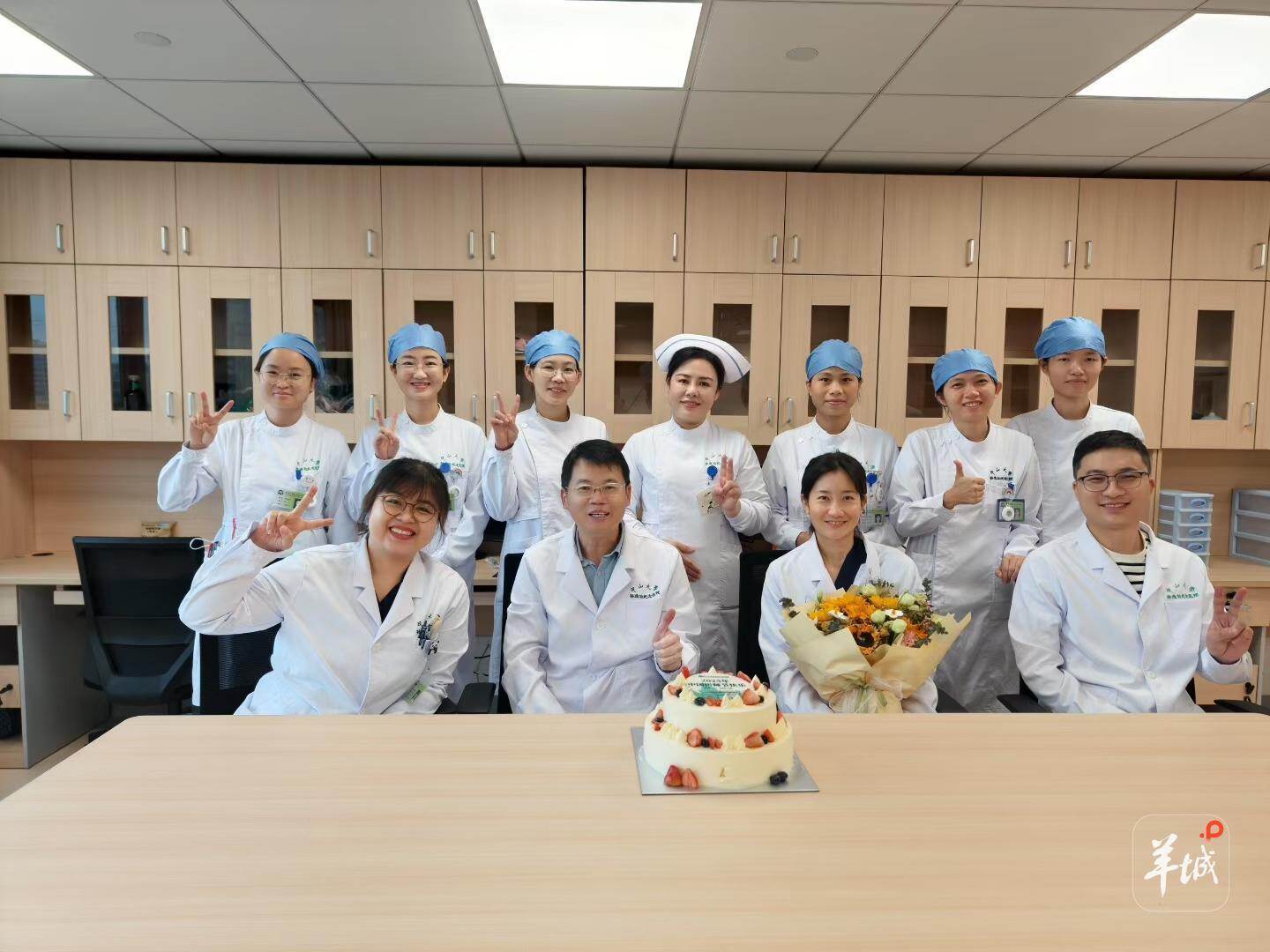 2025年8月恰逢中国医师节,广州市的中山大学孙逸仙纪念医院(花都院区),口腔颌面外科女医生林欣祤(第一排左一)和科室的医护们一起分享了蛋糕。通讯员供图