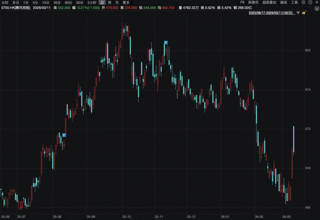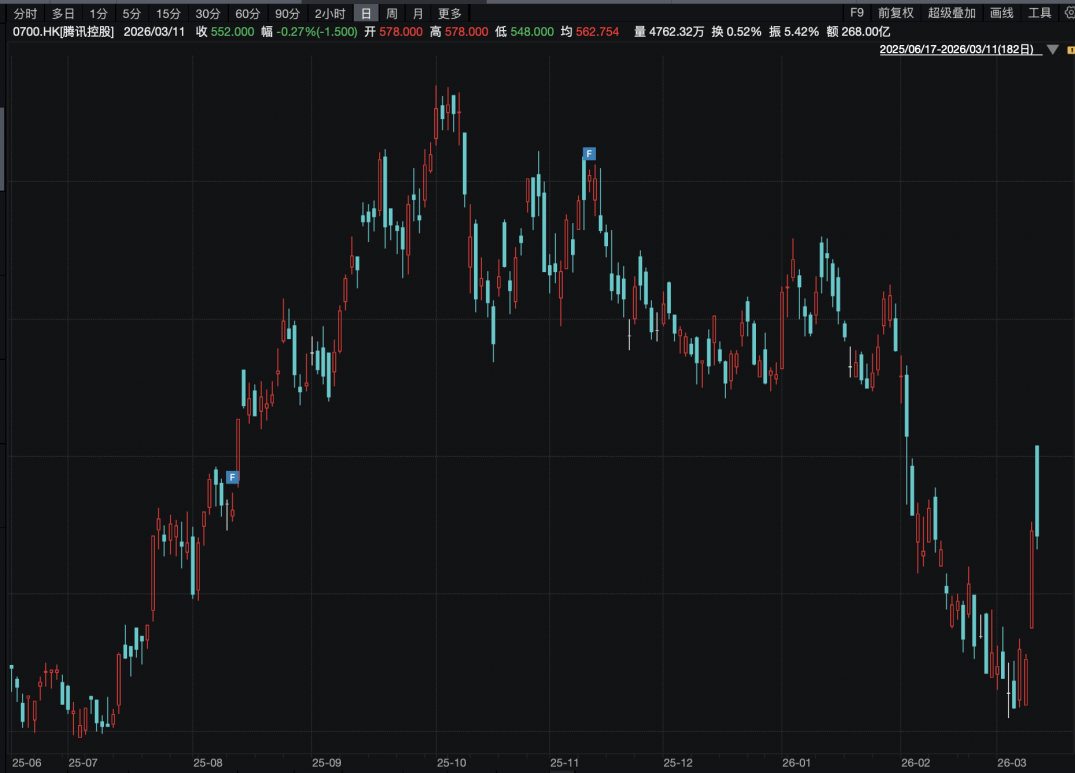 前一交易日罕见大涨7%后,3月11日,腾讯控股高开后收跌0.27%,成交额达268亿港元,总市值为50267亿港元。