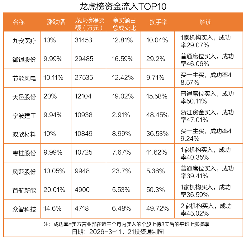3月11日,上证指数上涨0.25%,深证成指上涨0.78%,创业板指上涨1.31%。盘后龙虎榜数据显示,共有42只个股因当日异动登上龙虎榜,资金净流入最多的是九安医疗(002432.SZ),达3.15亿元。