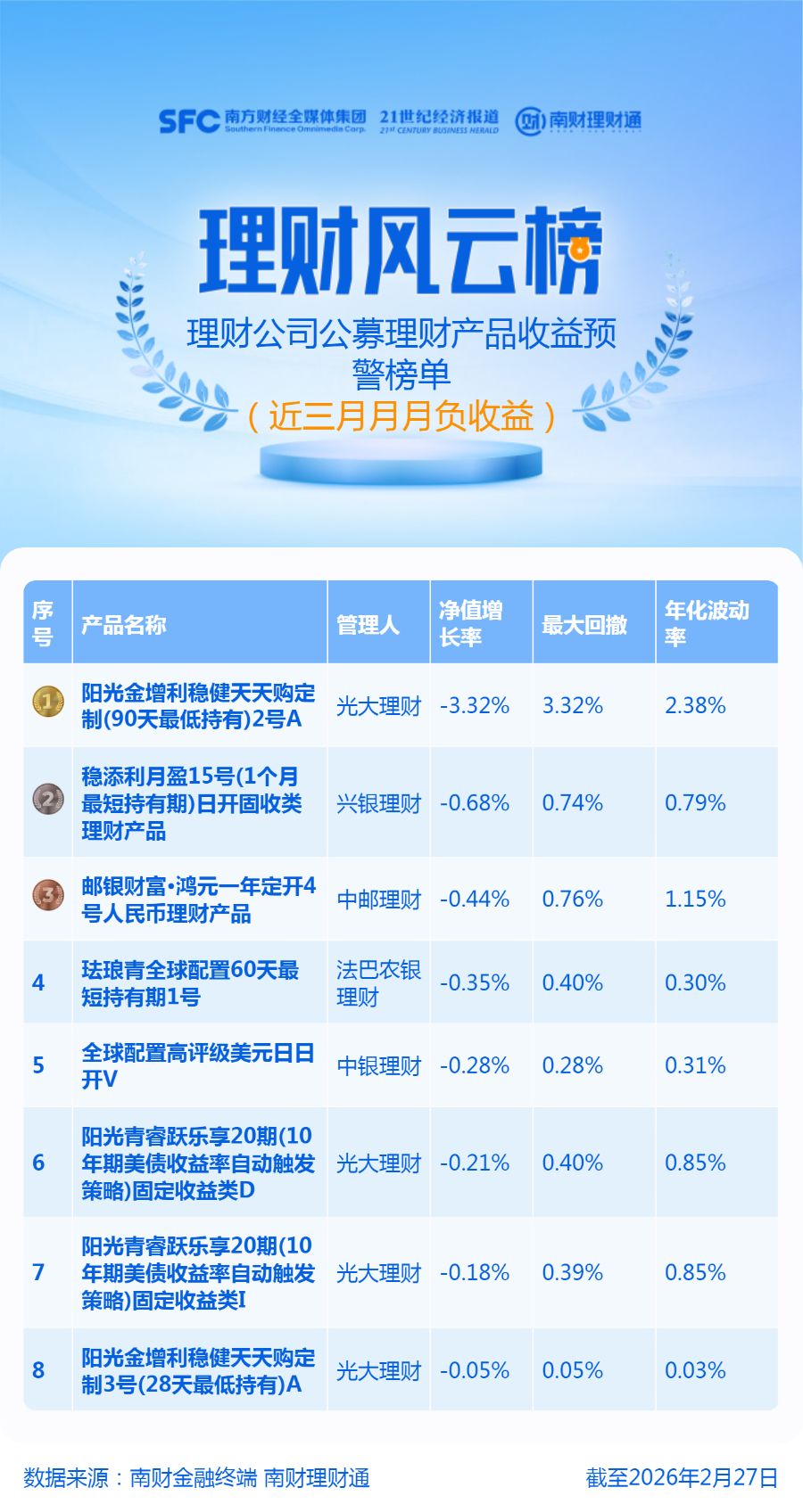 产品筛选范围为理财公司近3月(12月、1月、2月)月月负收益的公募理财产品,排名依据为近3月净值增长率,统计截至日期为2026年2月末。