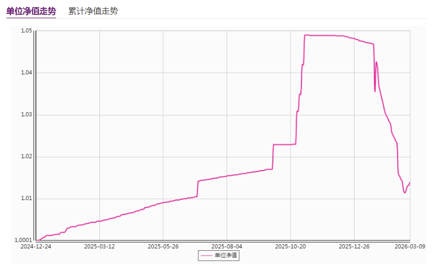 从往期运作情况来看,该产品成立后一度呈现稳健增长态势,2025年一季度主要配置定期存款与债券。然而自2025年7月起,产品风格骤变,净值出现多段阶梯式跳跃上涨。进入2026年,产品走势急转直下,1月中旬以来净值持续下行,期间虽有小幅反弹,但未能扭转颓势。