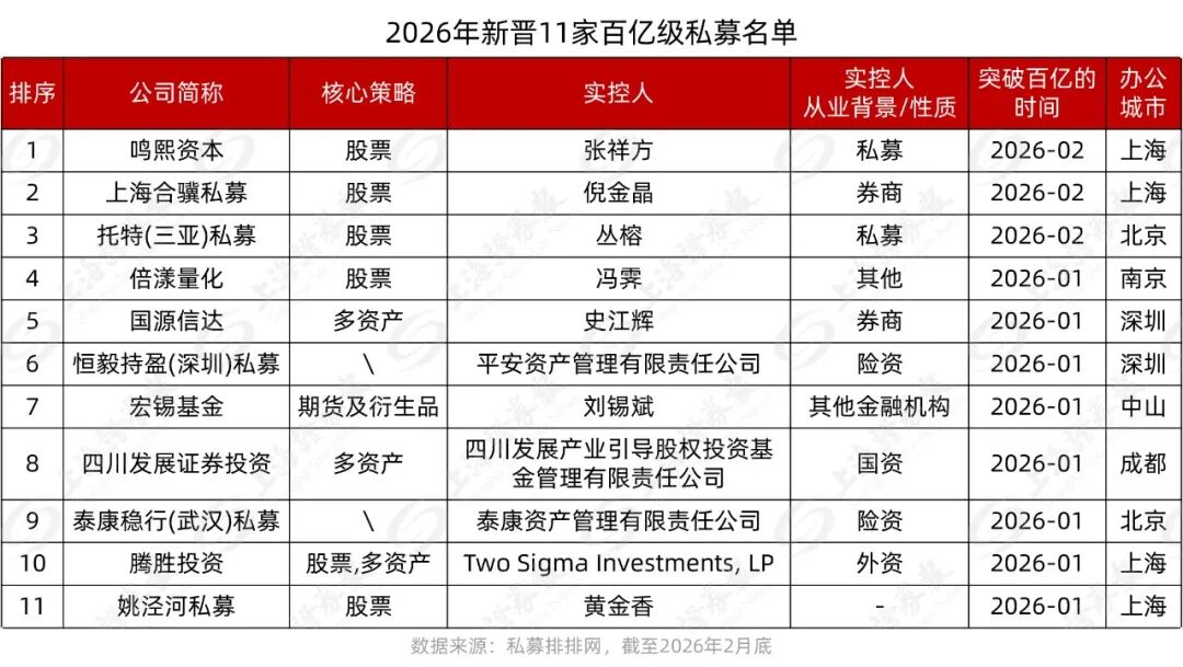 私募排排网数据显示,截至2026年2月底,百亿级私募数量达126家,较2025年底的113家相比增加了13家,较1月底的122家相比增加了4家,再创历史新高。