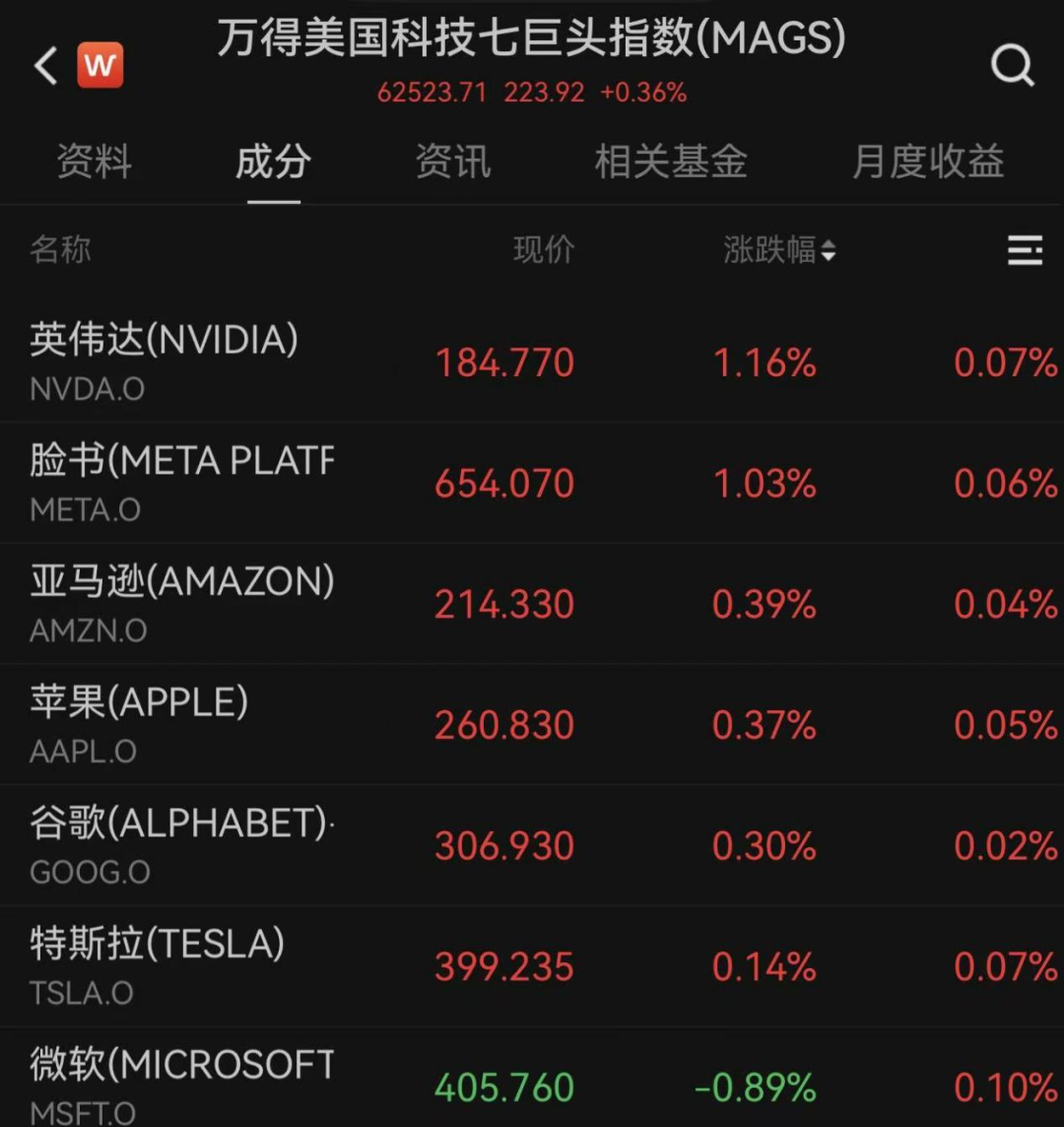 万得美国科技七巨头指数涨0.36%。英伟达、META均涨超1%。