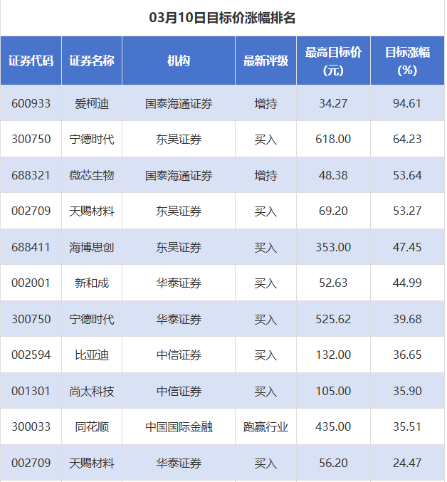 越声投研数据显示,3月10日,券商给予上市公司目标价共18次,按最新收盘价计算,目标价涨幅排名居前的公司有爱柯迪、宁德时代、微芯生物,目标价涨幅分别为94.61%、64.23%、53.64%,分别属于汽车零部件、电池、化学制药行业。