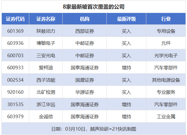 首次覆盖方面,3月10日券商共给出了8次首次覆盖,其中陕鼓动力获得西部证券给予“买入”评级,博敏电子、三安光电均获得中邮证券给予的“买入”评级,爱柯迪获得国泰海通证券给予“增持”评级,西子洁能获得国盛证券给予“买入”评级。