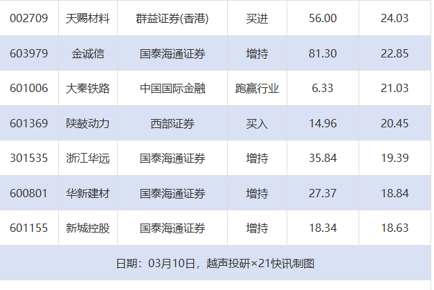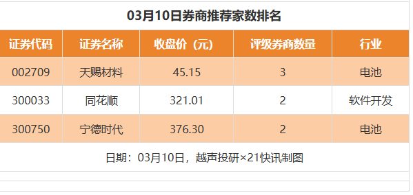 从券商推荐家数来看,3月10日有29家上市公司得到券商推荐,其中天赐材料获得3家推荐,同花顺、宁德时代均获得2家推荐。