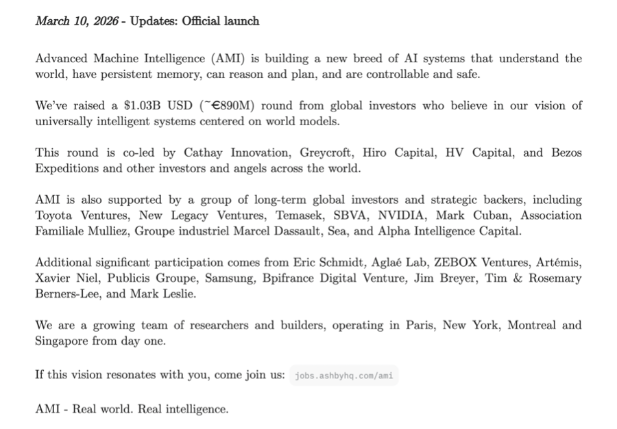 “AI教父”杨立昆(Yann LeCun)的新公司AMI Labs(先进机器智能实验室),正式宣布完成10.3亿美元融资,估值35亿美元。这也是欧洲史上最大的种子轮。投资人包括英伟达、贝索斯家族投资机构、新加坡淡马锡,以及万维网之父Tim Berners-Lee、前谷歌CEO Eric Schmidt等一批重量级个人投资者。杨立昆是2018年图灵奖得主,卷积神经网络(CNN)的奠基人之一,在Meta担任首席AI科学家12年。他于2025年11月离开Meta,随后官宣担任AMI Labs的董事长。公司定位押注世界模型,不做LLM。