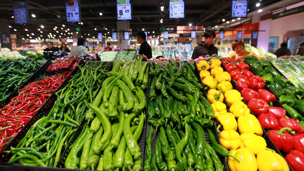 消费者在山东省临沂市平邑县一家超市选购蔬菜。新华社发(武纪全 摄)