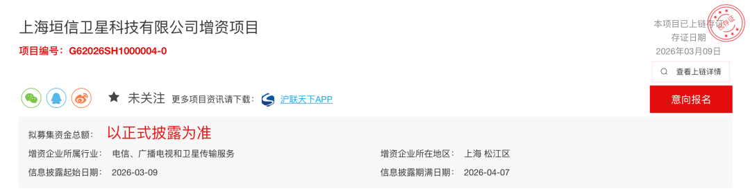 近日,上海联合产权交易所“增资预披露”栏目披露了“上海垣信卫星科技有限公司增资项目”。项目拟募集资金总额和股权比例以正式披露为准,信息披露日期为3月9日到4月7日。