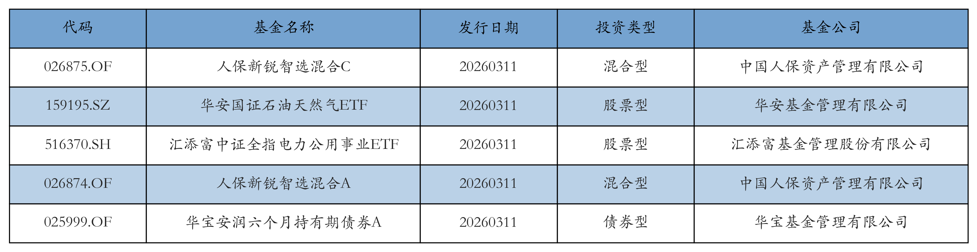 昨日有5只新基金发行,分别为:人保新锐智选混合C、华安国证石油天然气ETF、汇添富中证全指电力公用事业ETF、人保新锐智选混合A、华宝安润六个月持有期债券A,详情见下表: