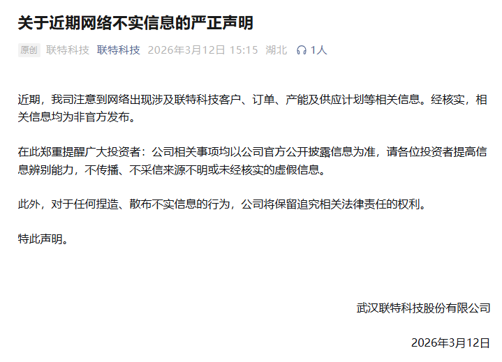 当天下午,联特科技发布《关于近期网络不实信息的严正声明》,称公司注意到网络出现涉及联特科技客户、订单、产能及供应计划等相关信息。经核实,相关信息均为非官方发布。联特科技提醒投资者,公司相关事项均以公司官方公开披露信息为准,请各位投资者提高信息辨别能力,不传播、不采信来源不明或未经核实的虚假信息。此外,对于任何捏造、散布不实信息的行为,公司将保留追究相关法律责任的权利。