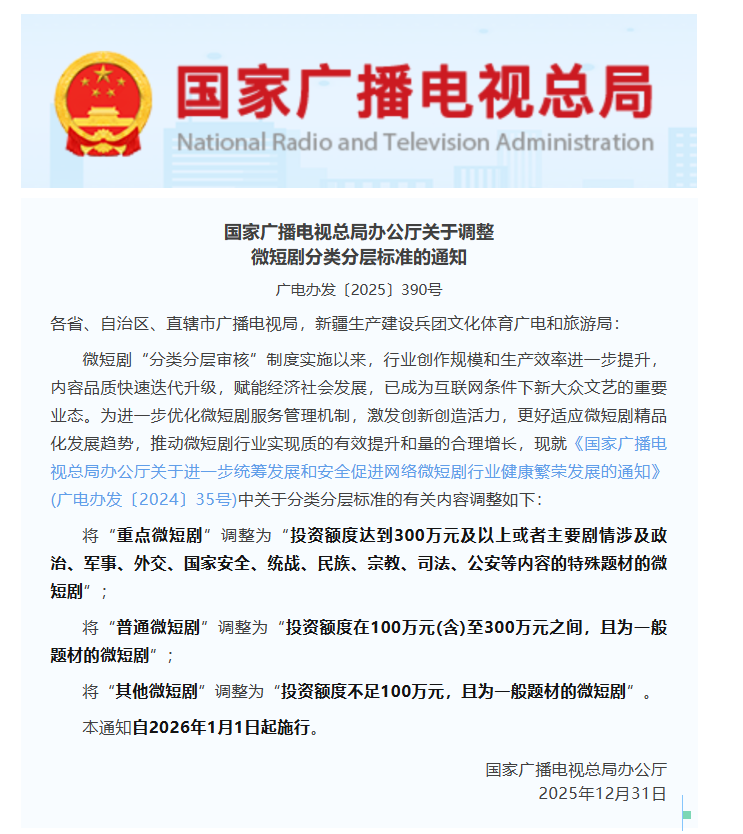 进入2026年,国家广播电视总局印发了《关于调整微短剧分类分层标准的通知》,对微短剧的分类分层审核标准表述进行调整,除了继续实施“重点微短剧”“普通微短剧”“其他微短剧”三级分类之外,还明确了最新的各类别投资标准。即2026年1月1日起正式施行微短剧分类新标准,重点微短剧投资门槛从100万元提升至300万元,普通微短剧从30万元提至100万元。业内普遍认为,这一调整有助于进一步提升管理效率,推动行业逐步走向规范发展。