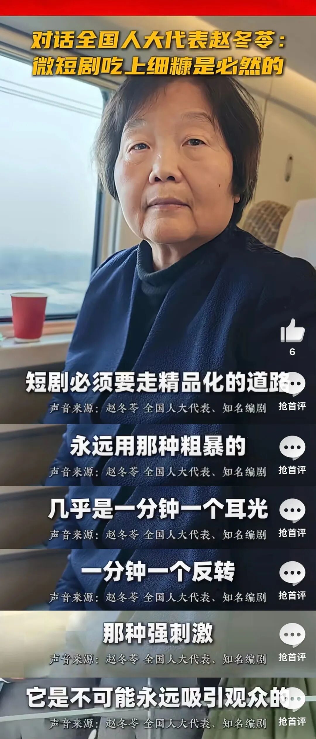 全国人大代表、作家、编剧赵冬苓则提到,当前大部分微短剧还是通过平台“自审自播”,审核标准不一,容易在未成年人保护、价值观导向等方面缺乏明确的量化标准。她呼吁能落实执行“先备案、后开机”,把长短剧在内的影视内容管理统一起来。既能促进鼓励微短剧创作者深耕优质内容,也能促进影视产业的发展,持续为观众提供优质的精神食粮。
