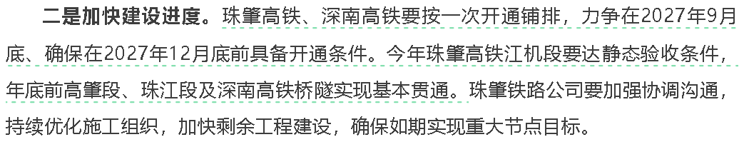 今年珠肇高铁江机段要达静态验收条件,年底前高肇段、珠江段及深南高铁桥隧实现基本贯通。