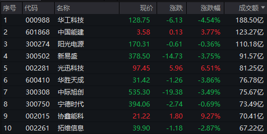 个股方面,华工科技成交额超188亿元居首,中国能建、阳光电源、新易盛成交额靠前。