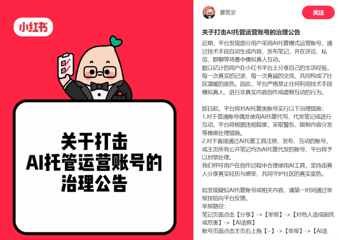 即日起,平台将对AI托管类账号实行以下治理措施: