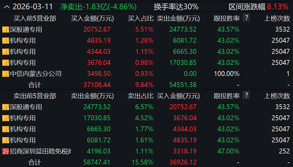 3月11日,南网数字涨8.13%,全天换手率达47.51%,龙虎榜数据显示,上榜营业部席位合计净卖出1.83亿元。具体来看,深股通专用与机构席位开始大举卖出;其中,机构合计净卖出1.69亿元,深股通专用买入2.08亿元、卖出2.48亿元。