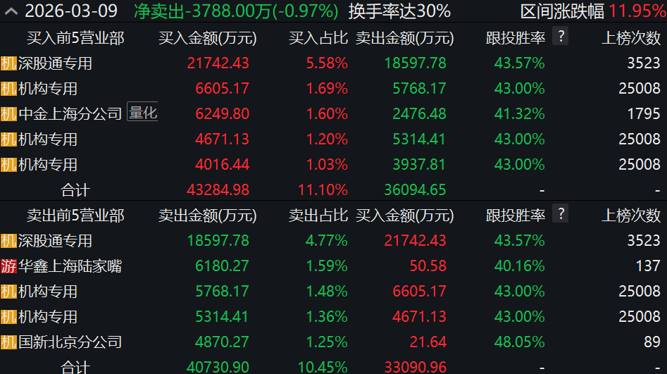 3月9日,南网数字继续上涨11.95%,全天换手率达52.98%。龙虎榜数据显示,上榜营业部席位合计净卖出3788.0万元。具体来看,机构合计净买入272.35万元;此外,深股通专用、中国国际金融上海分公司分别买入2.17亿元、6249.80万元;深股通专用、华鑫证券上海陆家嘴证券营业部分别卖出1.86亿元、6180.27万元。