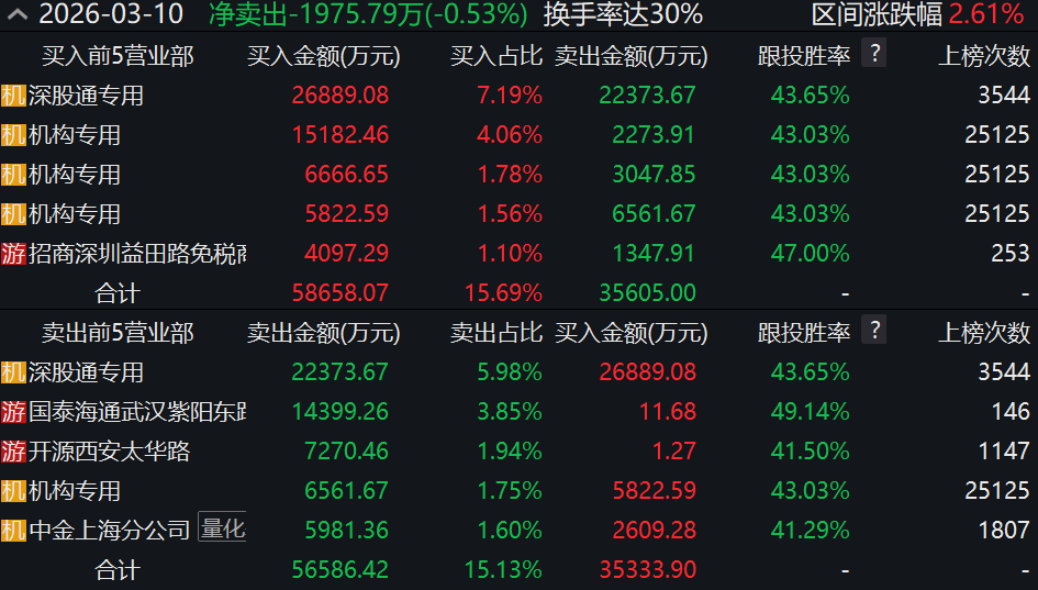 3月10日,南网数字虽仅上涨2.61%,但全天换手率达48.97%。龙虎榜数据显示,上榜营业部席位合计净卖出1975.79万元。具体来看,深股通专用与机构席位依然霸榜买入前四;其中,机构合计净买入1.58亿元,深股通专用买入2.69亿元、卖出2.24亿元。