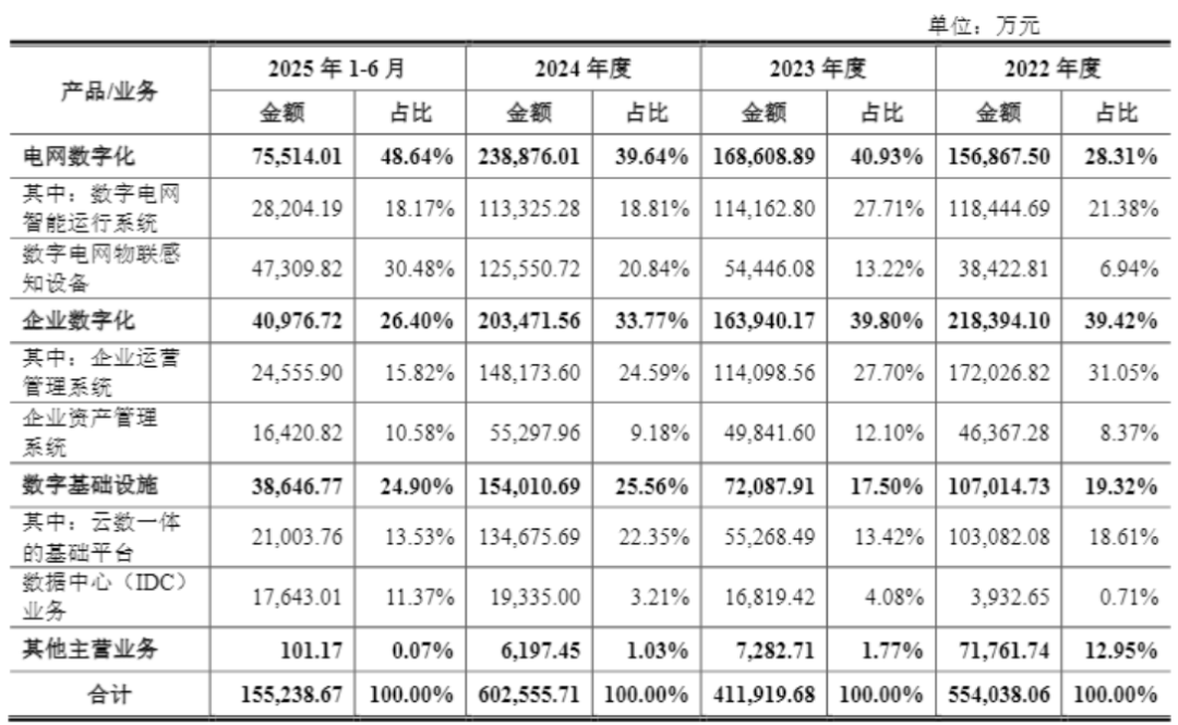 据招股书,2022年至2024年及2025年上半年,南网数字主营业务收入分别约为55.4亿元、41.19亿元、60.26亿元和15.52亿元;其中电网数字化收入占比分别为28.31%、40.93%、39.64%和48.64%。