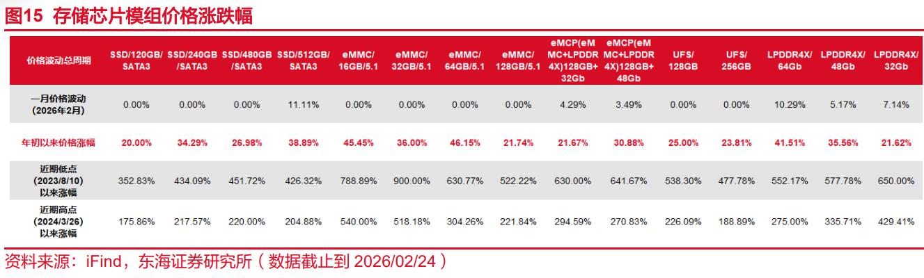 东海证券指出,2月半导体整体价格延续上涨,存储等部分细分领域出现供不应求情况,3月涨价叙事或将延续。全球半导体2025年12月销售额同比为37.13%,全年累计同比为23.47%,增速环比上升,体现出需求端的整体复苏。以存储为例,2026年2月存储模组价格整体涨跌幅区间为0%-11.11%;存储芯片DRAM和NAND FLASH的价格涨跌幅区间为0%-8.77%,虽受春节假期影响涨幅有所收敛,但仍延续1月涨势。从全球龙头企业看,2025Q4业绩大多实现同比增长,整体库存依然维持近几年高位,部分周转天数有所下降。供给端看,全球半导体设备2025Q3出货额同比增长10.80%,日本半导体设备2026年1月出货额同比增长2.57%,2025年同比为14.04%,或表示1-2年产能扩展较为积极。2025Q4晶圆厂产能利用率与晶圆价格同比均有所上升。