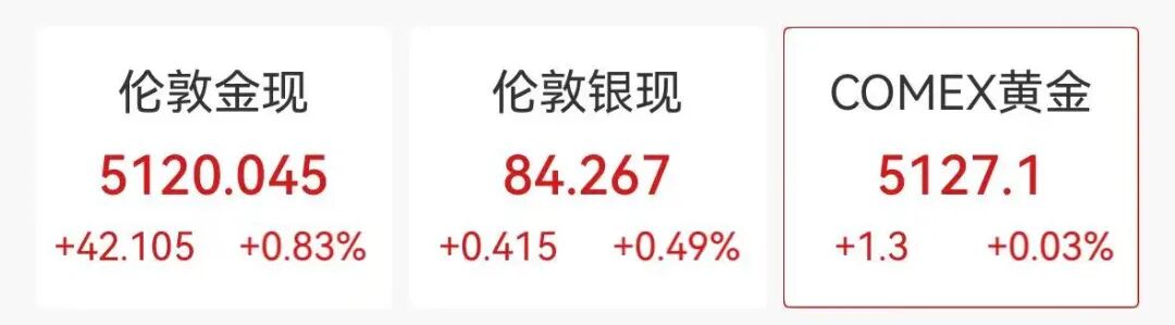 金银拉升,现货黄金报5120美元/盎司,现货白银报84.26美元/盎司,涨近0.5%。