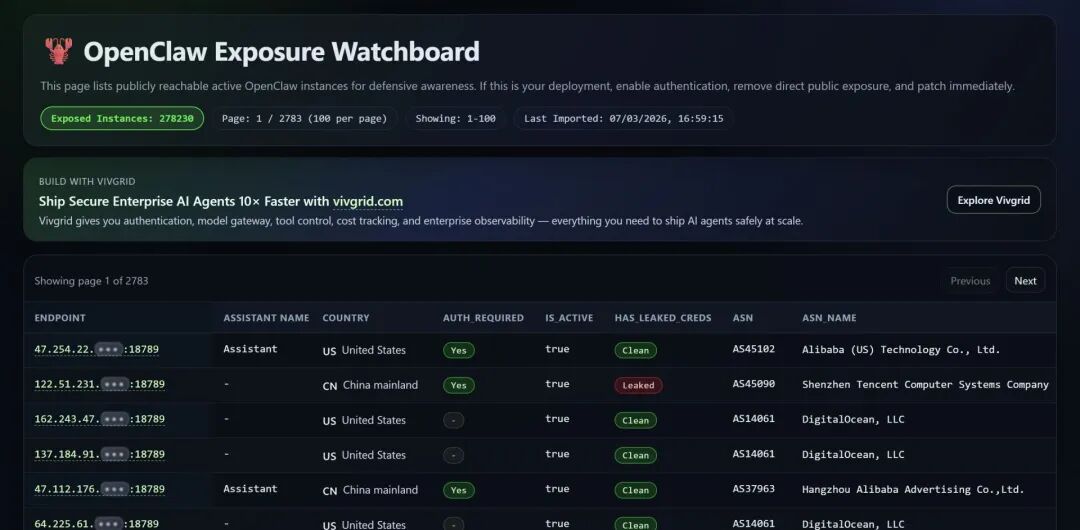 每经记者在OpenClaw Exposure Watchboard(曝光看板)上看到, 已有近28万个OpenClaw实例暴露在公网上 。