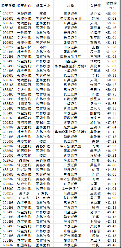 统计数据显示,在不分行业的亏损名单中,环保、美容护理、医药生物三大行业占据前10名中的8个席位。其中,国盛证券分析师杨心成于2025年7月14日推荐的惠城环保(300779)表现最差,该股从评级次日226.70元的收盘价跌至最新102.02元,区间亏损达54.99%。