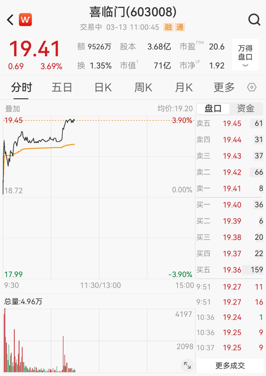 3月13日,喜临门早盘股价震荡走高,截至9:50,股价报19.25元/股,涨2.83%。
