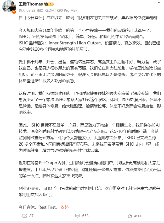 就在昨天(3月12日),王腾在个人微博上公布了新公司的英文品牌名“ISHO”,发音为“宜休”,其含义为“Inner Strength High Output”(积蓄精力,释放高效)。王腾透露,目前公司正在筹备ISHO APP的内测工作,后续将面向用户开放内测邀请。商标布局方面,该公司已启动全球20多个国家和地区的商标注册工作。