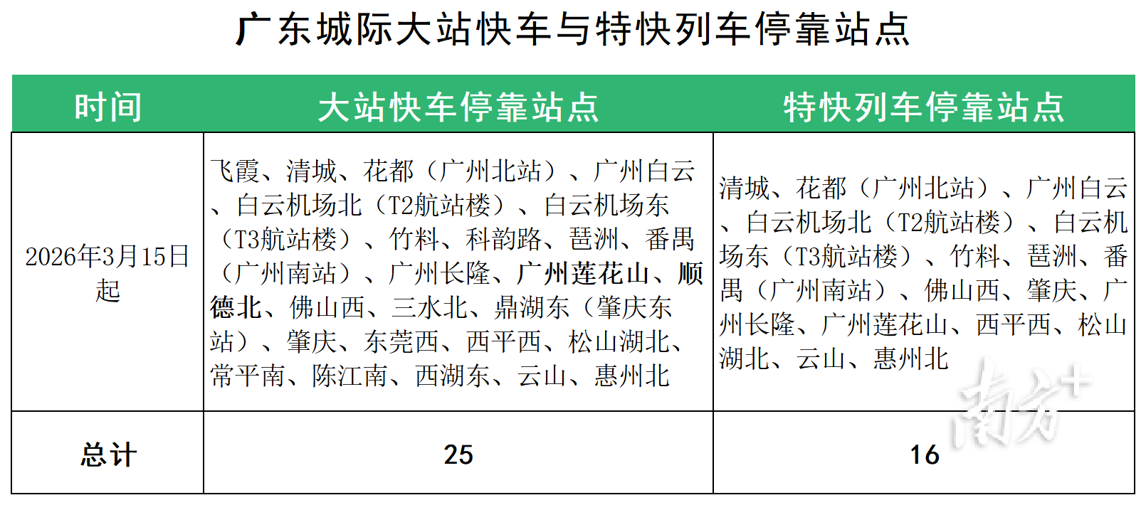 同时,结合客流数据,广惠、广肇城际将新增广州莲花山站和顺德北站为“大站快车”停靠站。调整后,搭乘广惠城际“大站快车”如需前往白云机场和花都方向的旅客,可在广州莲花山站同站台换乘。此外,通过合理调整停站设置,减少列车停站时间,进一步提升旅客出行效率。