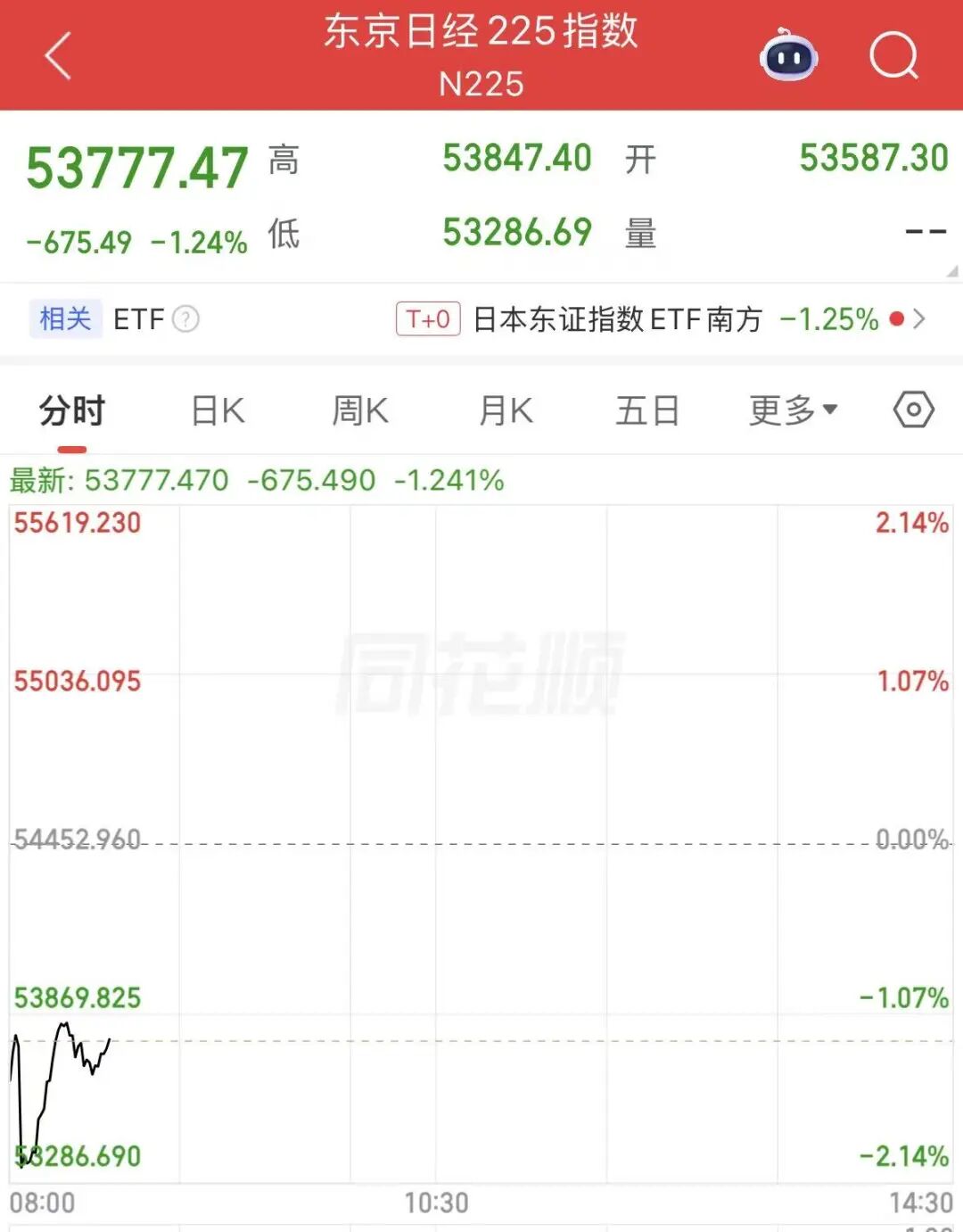 3月13日,日韩股市低开,日经225指数一度跌超1100点,失守53000点关口,随后跌幅收窄至1.24%;韩国KOSPI指数开盘跌超3%,截至发稿,跌幅收窄至2%。
