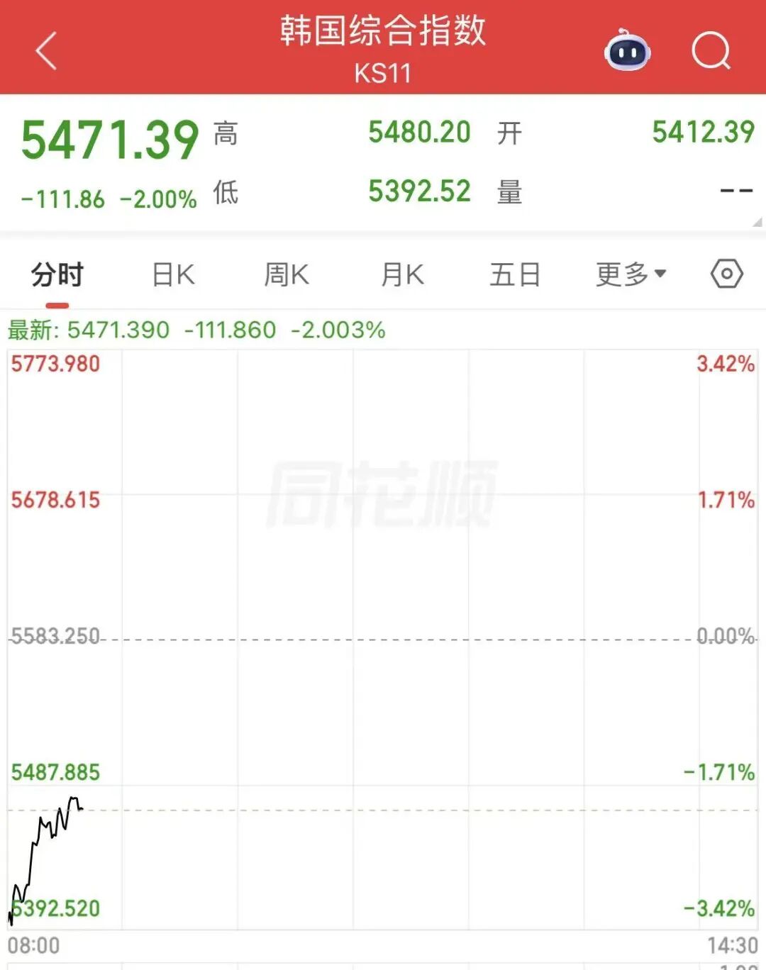 此外,韩股 SK海力士、三星电子股价跌超4%。