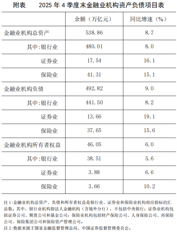 初步统计, 2025年4季度末,我国金融业机构总资产为538.86万亿元,同比增长8.7%,其中,银行业机构总资产为480.01万亿元,同比增长8.0%;证券业机构总资产为17.54万亿元,同比增长16.1%;保险业机构总资产为41.31万亿元,同比增长15.1%。