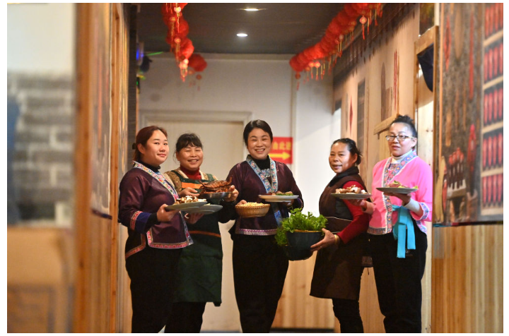 2025年2月28日,在广西柳州市融水苗族自治县融水镇一家餐馆,负责人吴葵花(中)和员工展示菜品。吴葵花经营餐馆22年,长期为当地农村群众提供稳定就业岗位,并收购偏远山区群众种植的蔬菜。在广西大山里,一批女能人活跃在农村电商、民宿餐饮、乡村文旅等各个领域,带动留守妇女发展产业,实现就近居家就业创业。新华社记者 黄孝邦 摄