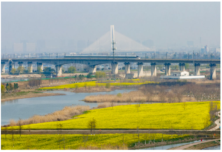 2026年3月11日,一列高铁列车穿行在安徽省合肥市肥东县十八联圩生态湿地(无人机照片)。新华社记者 杜宇 摄