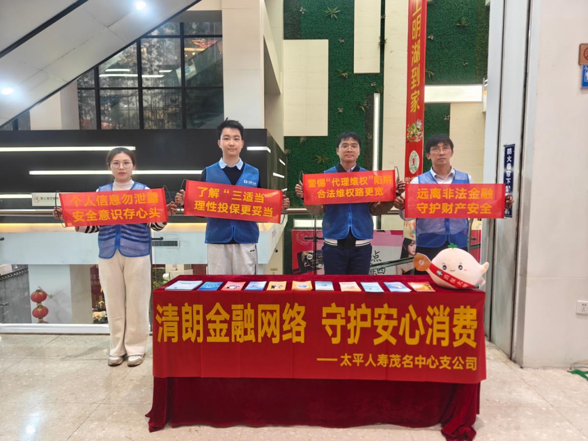 太平人寿茂名中心支公司走进东信时代广场及菜鸟驿站,开展“3·15”金融消费者权益保护宣传活动。活动通过设立展台、发放折页、现场讲解及“一对一”咨询等方式,向公众特别是老年人、新市民普及防诈骗、个人信息保护等知识,提醒警惕养老陷阱,帮助树立理性消费观念,有效提升了金融风险防范意识。