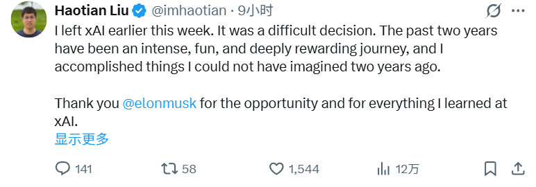 本周四,负责图像生成产品的张国栋宣布离开公司,另一名创始成员刘浩天也发文确认离职并直言“燃尽了”(burn out)。 周五又有消息称, 戴子航也已经离开xAI 。至此,“11罗汉”中最多只剩曼努埃尔·克罗伊斯(Manuel Kroiss)和罗斯·诺丁(Ross Nordeen)两人还留在公司。